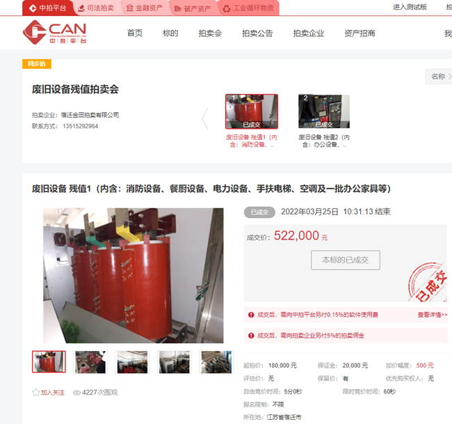 3月25日上午10時,城發(fā)公司一批廢舊消防設(shè)備、餐廚設(shè)備、電力設(shè)備、手扶電梯、空調(diào)等物資在中拍平臺公開拍賣,經(jīng)過30分鐘的緊張激烈競價,最終以522000元成交標(biāo)的,比評估價180000元高出342000元,溢價率190%。
